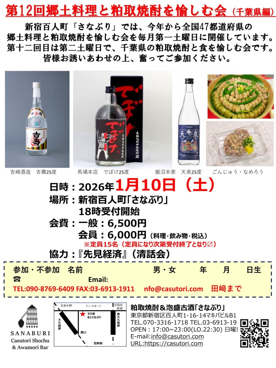 「さなぶり試飲会」第12回目は千葉県の粕取焼酎と郷土食を楽しむ会です。