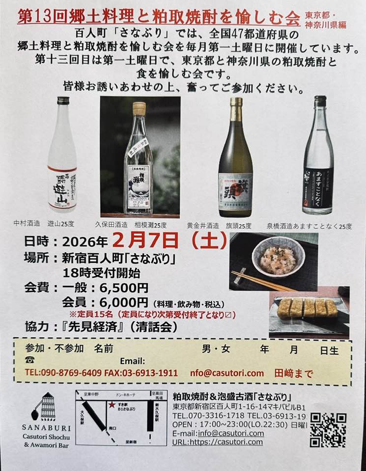 「さなぶり試飲会」第13 回目はお膝元「東京&神奈川県」の粕取焼酎と郷土食を楽しむ会です。