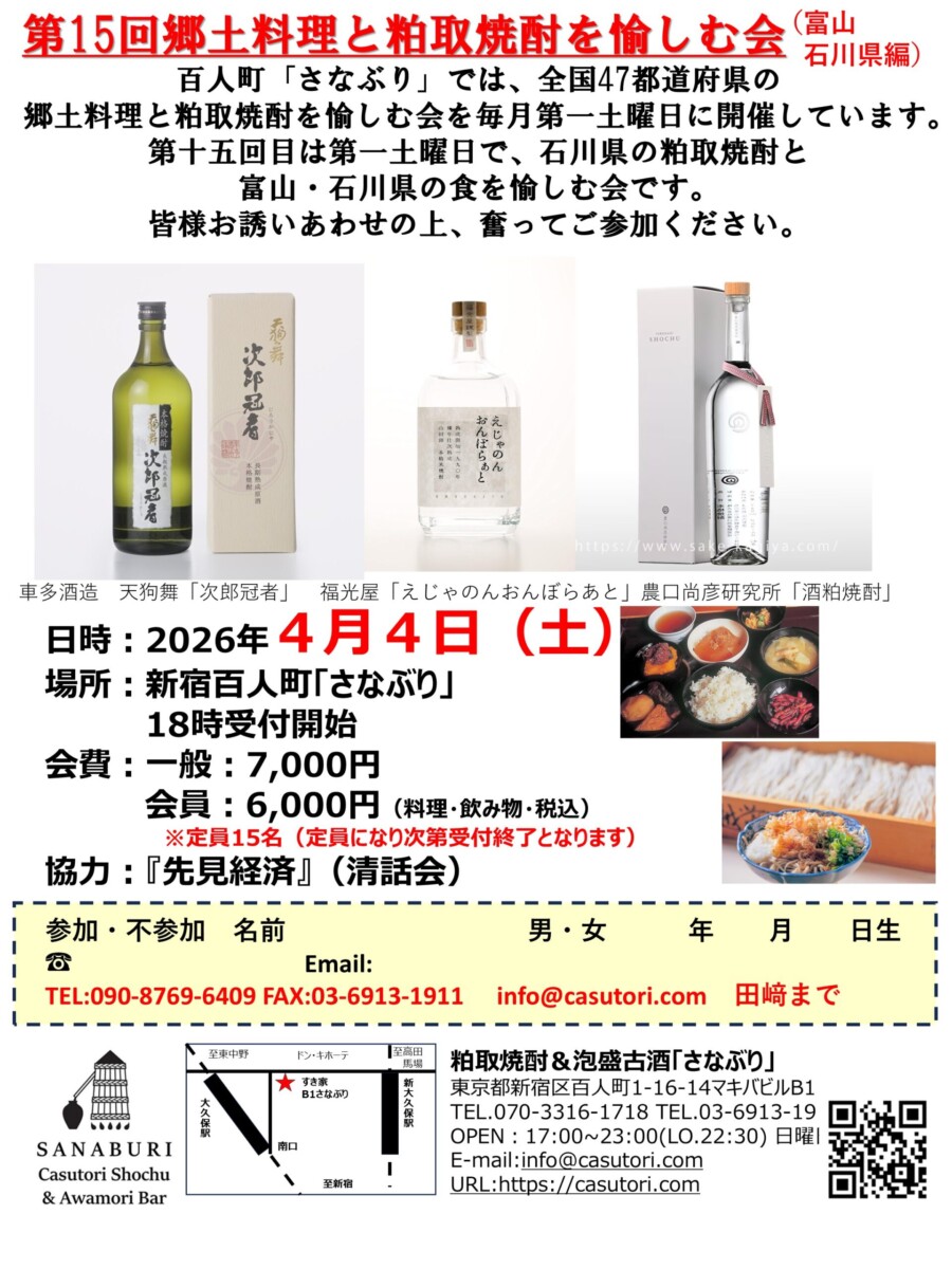 第15回目は富山県及び石川県の粕取焼酎と食を愉しむ会です。