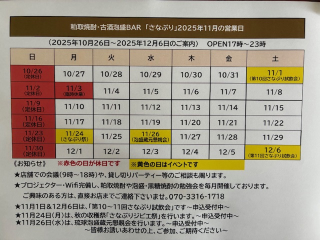 粕取焼酎・古酒泡盛BAR「さなぶり」2025年11月営業日のご案内です。