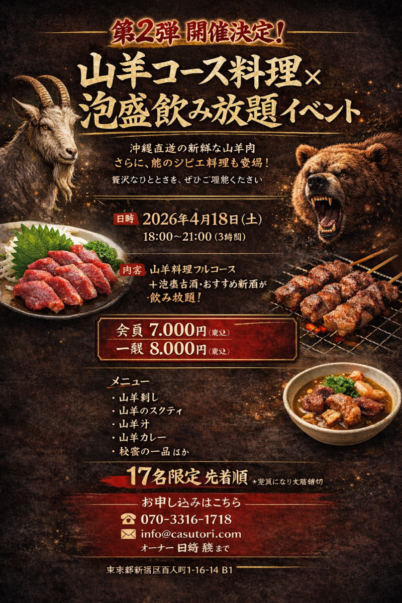 『山羊コース料理とジビエと泡盛飲み放題イベント」を2026年4月18日(土)に開催いたします。